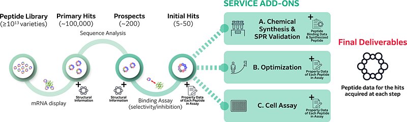 Fujifilm offers a comprehensive suite of contract services. Our core offerings include the use of mRNA display technology to discover peptides that bind strongly and specifically to target proteins, combined with rapid structural optimization and activity screening of these hit peptides (e.g., inhibitory activity, selectivity). Additionally, we provide supporting services such as peptide chemical synthesis and the preparation of target proteins.