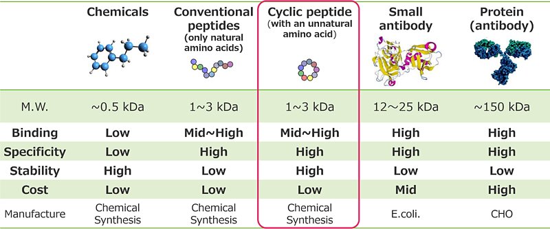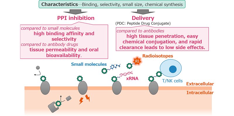 Peptides are gathering significant attention, not only for their affinity and specificity towards a diverse array of target proteins but also for their tissue permeability (oral suitability) and ease of chemical synthesis. Notably, cyclic peptides that incorporate unnatural amino acids are expected as PPI inhibitors. Additionally, they are anticipated to act as DDS ligands, facilitating the delivery of nucleic acid-based medicines and other drugs to targeted tissues/cells due to their exceptional binding affinity and stability.