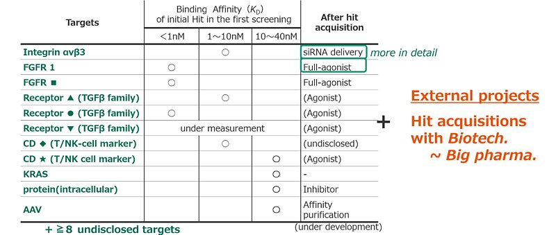 Peptides with wide varieties and high-affinities(~nM) can be obtained with high success rate. (If you are interested in details of our track record, please feel free to contact us).