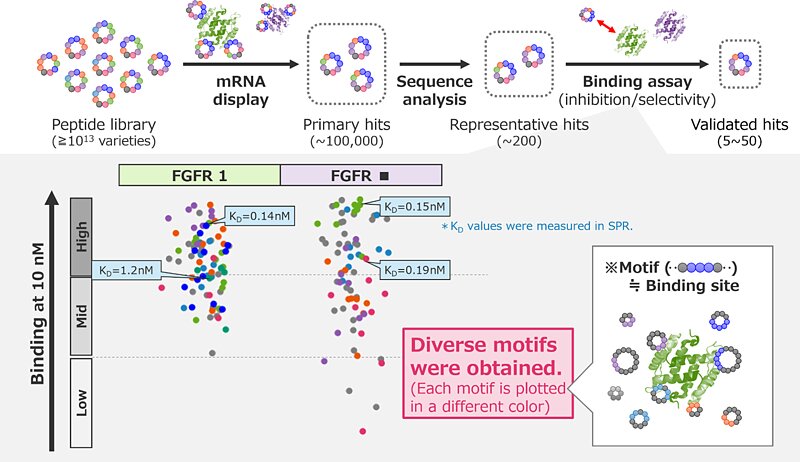 Diverse binding peptides were successfully obtained toward both of 2 FGFRs (fibroblast growth factor receptor).