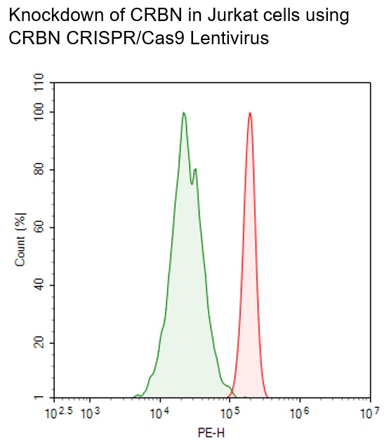 - Description: Cereblon (CRBN) forms an E3 ubiquitin ligase complex which is responsible for ubiquitinating proteins that regulate various developmental processes. CRBN also binds to Calcium Activated Potassium Channel subunit alpha-1 (KCNMA1) to regulate ion transport. Moreover, mutations in CRBN may play an underlying role in tumor cells acquiring resistance to immunotherapy. The CRBN CRISPR/Cas9 Lentiviruses are replication incompetent, HIV-based VSV-G pseudotyped lentiviral particles that are ready to transduce almost all types of mammalian cells, including primary and non-dividing cells. The particles contain a CRISPR/Cas9 gene driven by an EF1a promoter, along with 5 sgRNA (single guide RNA) targeting human CRBN. The DNA transduced by this lentivirus integrates randomly into the cellular genome to express both Cas9 and sgRNA. Puromycin selection increases the knockout efficiency by forcing high expression levels of both Cas9 and the sgRNA, and can be used with the integrating lentivirus to quickly and easily achieve high knockdown efficiencies in a cell pool. Efficiencies also depend on the cell type.
