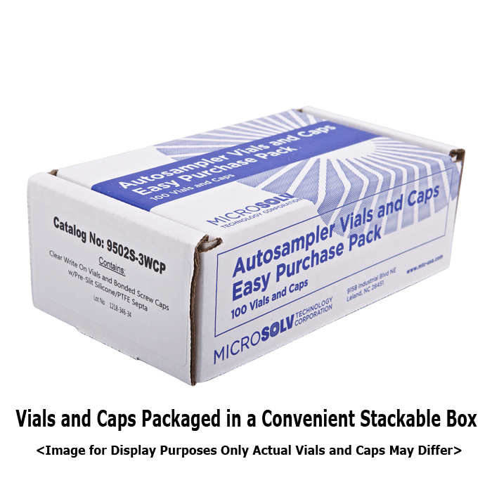 Easy Purchase Packs are a convenient way to order and inventory autosampler vials with their matching caps. The kit packaging will open and re-close making it useful for keeping vial and cap types matched, organized and clean during use. This is one of our Most Popular Easy Purchase Packs.Click on links below for more Specifications for the 11mm Vials and Caps:Supplied with Vials: Cat. No 9572C-MS and Caps: Cat No. 9502C-30CB